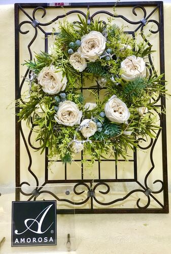 プリザーブドフラワーメーカー・アモローサ様よりステキなリースが届きました! アーティフィシャルフラワーとアモローサ「プラチナホワイト」をMIXしたリースです。