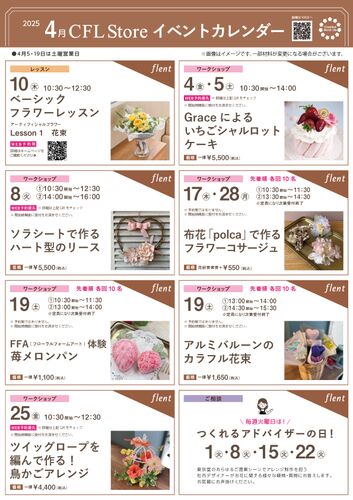 いつも CFL Store をご利用いただき誠にありがとうございます。 4月の暖かい陽気の中、flentで手作りアレンジメントを体験しませんか? ご自身で作った作品は、母の日ギフトにもおすすめです。